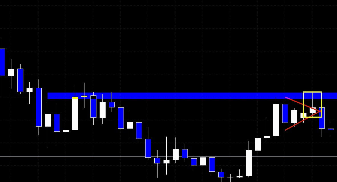 三角保ち合いの場合は、ブレイクした直後に売り(買い)の厚い領域があるのか確認しておく