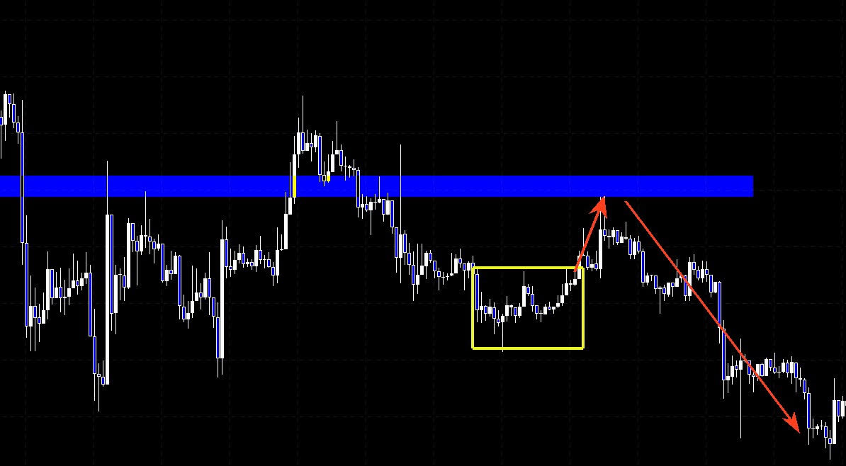 保ち合いを上抜けしましたが売りの厚い抵抗帯で跳ね返され、保ち合い部分を下抜けしています。